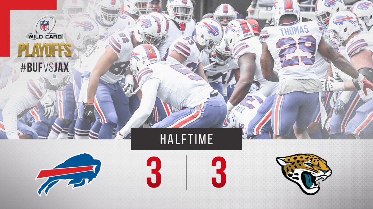 המשחק התחיל כצפוי. משחק שמרני במיוחד של שתי קבוצות שהצד החזק שלהם הוא הגנה, שתי קבוצות "צווארון כחול" שעושות את העבודה השחורה. שתי ההתקפה התקשו לפצח את הגנת היריב ברבע הראשון, בלייק בורטלס מסר פחות מ-50%, פורנט ומקוי השתלבו לפחות מ-3 יארד לנשיאה ומהלך המרשים ביותר של 15 הדקות הראשונות היה פאנט של נרוטמן שהג'אגס הורידו בתוך קו ה-5 של הבילס. זהו משחק הפלייאוף הראשון מאז איגלס-באקס בשנת 2000 שאף אחד לא עשה מהלך בטריטוריית היריב, מרשים ומבאס סימולטנית. בתחילת הרבע השני, טיירוד טיילור מסר מסירה חלשה שנחבטה באוויר ע"י מיילס ג'ק באינסטינקט של חתול, וארון קולבין היה בעל תושיה מספיק בשיל לעקוב אחרי המהלך ולחטוף את הכדור מהאוויר, החטיפה הראשונה שלו בקריירה. טיירוד טיילור נחטף בממוצע מכל 100 מסירות, 1.4 פעמים. היחס הנמוך בהיסטוריה של הליגה. מאידך, ג'קסונוויל מומחים בלחטוף את הכדורים מהאוויר, הם הציגו את היחס הגבוה ביותר של חטיפות/מסירות של קיובי יריב עם 4.3 אחוז. במצב של דאון רביעי ו-1, הבילס כבר התפשרו שער שדה ושלחו את האושקה לבעוט, אך טלווין סמית' עם טעות מטופשת וקפיצה מוקדמת שלו נתנו לבילס עוד סט של דאונים, 2 יארד מהאנדזון. אלו טעויות שעולות לקבוצות במשחקים צמודים שכאלו, קל וחומר בפלייאוף מול קבוצת הגנה חזקה. הדרייב הראשון שהוביל לנקודות היה כל כך ארוך ומתיש, שהבילס היו רחוקים כמה דקות ספורות מלהשוות את הזמן הג'אגס היו בהתקפה במשך כל המחצית! האושקה תפר שער שדה רל ונתן לבילס יתרון 3-0, פחות מ-2 דקות לסיום המחצית. הג'אגוארס במאזן 1-4 השנה כאשר הם לא שמים את הנקודות הראשונות על הלוח (הניצחון היחיד הגיע מול הסטילרס בשבוע 5, לאחר המשחק הידוע לשמצה של בן רות'ליסברגר). הדבר הכי מעניין לאחר חצי שעה של פוטבול? טוני רומו בעמדת השידור.